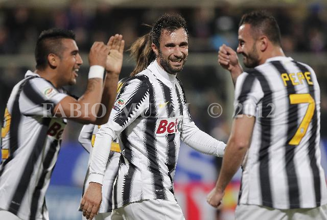 | ITALY, Florence : from left, Juventus' Arturo Vidal, Mirko Vulcinic and Simone Pepe celebrate after scored 2-0 against Fiorentina during their seria A soccer match at Artemio Franchi stadium in Florence, on March 17, 2012. (AFP PHOTO / FABIO MUZZI) | IMAGE_4657.JPG | 17/03/12 21.19 | |