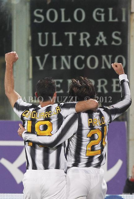 | ITALY, Florence : Juventus' Andrea Pirlo (R) celebrates together teammate Fabio Quagliarella 4-0 against Fiorentina during their seria A soccer match at Artemio Franchi stadium in Florence, on March 17, 2012. (AFP PHOTO / FABIO MUZZI) | IMAGE_4664.JPG | 17/03/12 22.16 | |