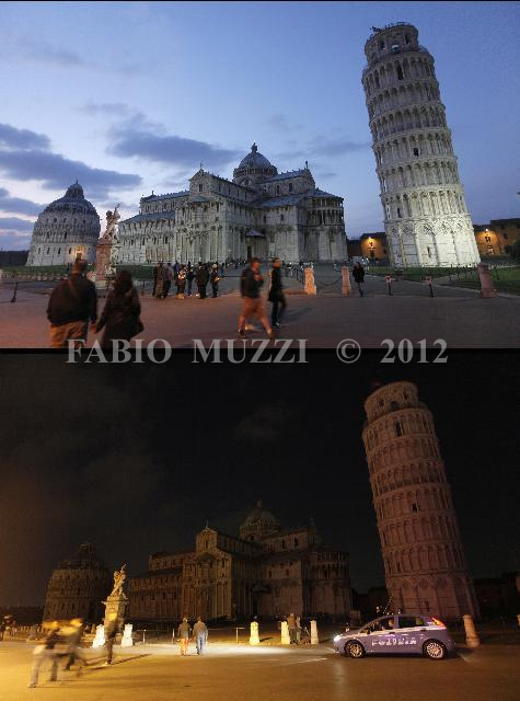 | ITALY, Pisa : A combo view of the leaning tower of Pisa and the Cathedral into the square of Miracles (up prior the lights off ) for an Earth Hour campaign in Pisa on March 31, 2012. World-famous landmarks including the Pyramids, the Eiffel, the Empire State Buildings will be dark Saturday as million turn out the ligthts for " Earth Hour", a rolling grassroots movement aimed at fighting climate change. AFP PHOTO / FABIO MUZZI | IMAGE_4694.JPG | 31/03/12 20.43 | |