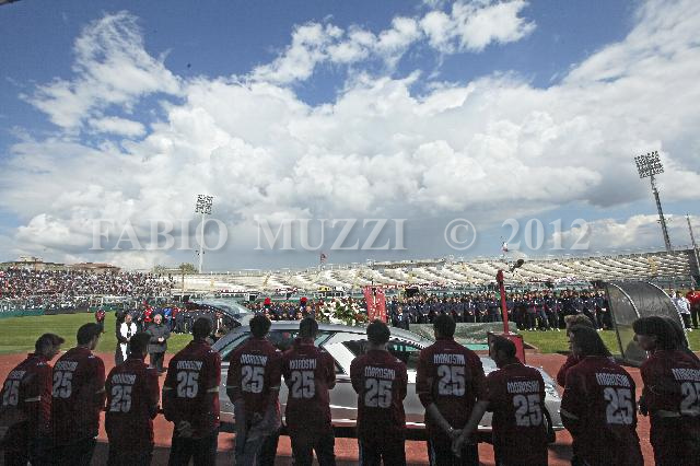 | ITALY, Leghorn : Livorno's players with T-shirt numer 25, number of Piermario Morosini, salute the hearse with Piermario Morosini enter inside the Armando Picchi stadium in Leghorn for the ceremony remembering the player of Livorno soccer team dead for hearth attack on saturday 14 during the match Pescara vs Livorno, on April 17, 2012. AFP PHOTO / FABIO MUZZI | IMAGE_4708.JPG | 17/04/12 14.58 | |