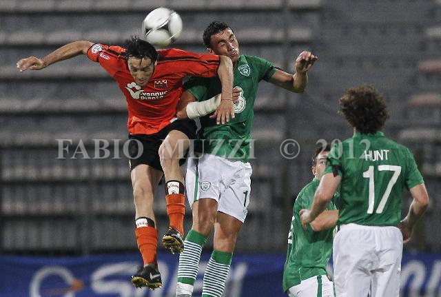 | ITALY, Pistoia : Republic of Ireland's Stephen Kelly (R) and Local italian representative Corrado Colombo vie for the ball during their friendly soccer match at Marcello Melani Stadium in Pistoia, on May, 29, 2012.(AFP Photo FABIO MUZZI) | IMAGE_4714.JPG | 29/05/12 20.16 | |
