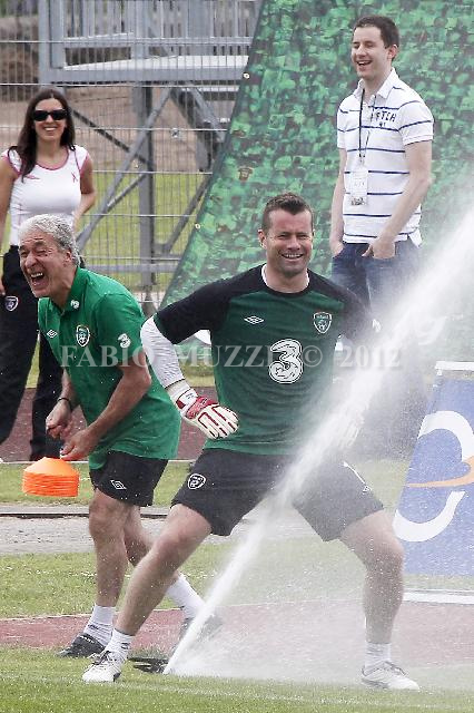 | ITALY, Borgo a Buggiano : Republic of Ireland's goalkeeper Shay Given (R) jockes with an irrigation system during a training session at Benedetti Stadium of Borgo a Buggiano, in Pistoia, on May 28, 2012. AFP PHOTO/ FABIO MUZZI | IMAGE_4716.JPG | 01/06/12 10.56 | |