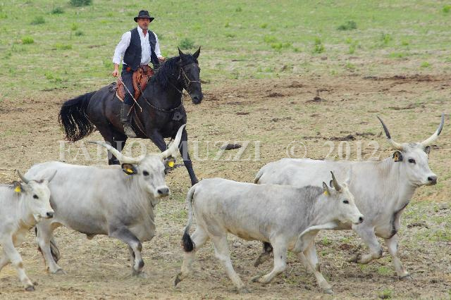 | ITALY, Terricciola : Ancien counrty worker named Butteri run with horses to move particular Maremmana' s oxes inside Montebello Elma factory, near Pisa in Tuscany region, central Italy, on May 24, 2012 (AFP PHOTO / FABIO MUZZI) | IMAGE_4728.JPG | 02/06/12 10.21 | |