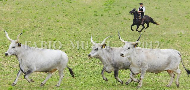 | ITALY, Terricciola : Ancien counrty worker named Butteri run with horses to move particular Maremmana' s oxes inside Montebello Elma factory, near Pisa in Tuscany region, central Italy, on May 24, 2012 (AFP PHOTO / FABIO MUZZI) | IMAGE_4729.JPG | 02/06/12 10.21 | |