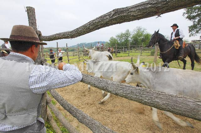| ITALY, Terricciola : Ancien counrty worker named Butteri run with horses to move particular Maremmana' s oxes inside Montebello Elma factory, near Pisa in Tuscany region, central Italy, on May 24, 2012 (AFP PHOTO / FABIO MUZZI) | IMAGE_4730.JPG | 02/06/12 10.25 | |
