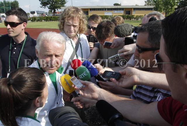 | ITALY, Borgo a Buggiano : Eire's football soccer coach team Giovanni Trapattoni during the press conference on the pitch at the end of the training session at Benedetti Stadium of Borgo a Buggiano, Pistoia, on May, 28, 2012. (AFP Photo FABIO MUZZI) | IMAGE_4739.JPG | 28/05/12 16.33 | |