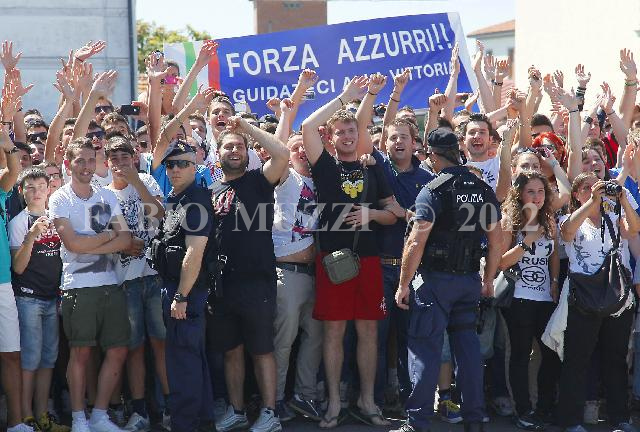 | ITALY, Pisa : Italian supporters cheers and incite his team while are boarding to fly to Cracovia, Poland, for next Euro 2012 Tournament on Poland and Ukraina, in Pisa' s airport on May 05, 2012 (AFP / STRINGER) | IMAGE_4745.JPG | 05/06/12 15.19 | |