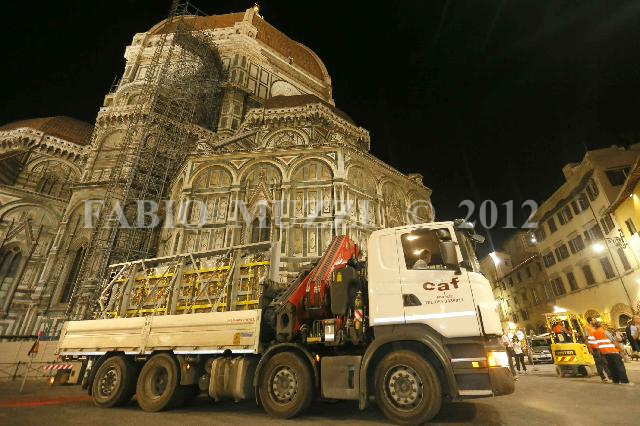 | ITALY, Florence : the gold of 4 tons doors of the baptisper of Florence is moved with special truck from the "Opificio delle pietre dure" after has been restorated within 33 years, and it will be placed inside the Museum of of Santa Maria del Fiore in Florence on June 26, 2012. AFP PHOTO / FABIO MUZZI | IMAGE_4746.JPG | 26/06/12 23.32 | |