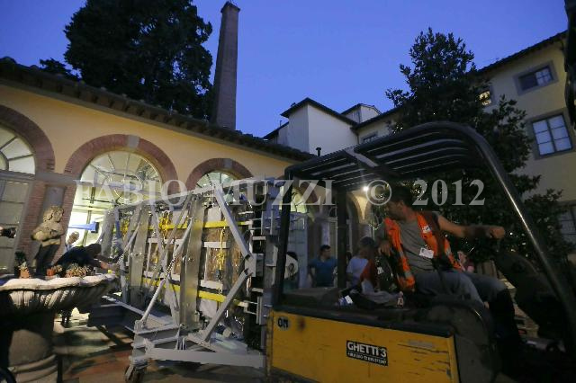 | ITALY, Florence : the gold of 4 tons doors of the baptisper of Florence is moved with special truck from the "Opificio delle pietre dure" after has been restorated within 33 years, and it will be placed inside the Museum of of Santa Maria del Fiore in Florence on June 26, 2012. AFP PHOTO / FABIO MUZZI | IMAGE_4748.JPG | 26/06/12 21.30 | |
