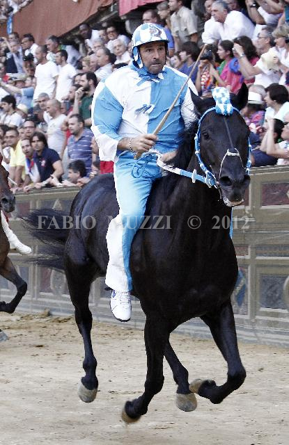 | ITALY, Siena : the Contrada of Wave with jockey Luigi Bruschelli runs to the victory during the Palio horse race in Siena on July 2, 2012. The Palio medieval race is held twice a year in Siena with jockeys riding bareback around a makeshift race course set up in the city's central square. AFP PHOTO/ FABIO MUZZI | IMAGE_4758.JPG | 02/07/12 18.45 | |