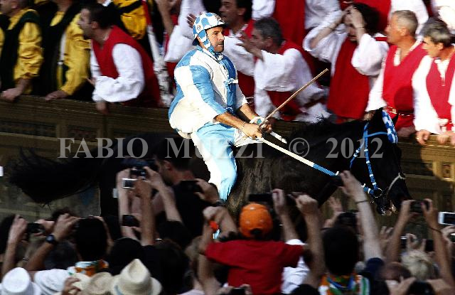 | ITALY, Siena : the Contrada of Wave with jockey Luigi Bruschelli runs to the victory during the Palio horse race in Siena on July 2, 2012. The Palio medieval race is held twice a year in Siena with jockeys riding bareback around a makeshift race course set up in the city's central square. AFP PHOTO/ FABIO MUZZI | IMAGE_4762.JPG | 02/07/12 18.45 | |