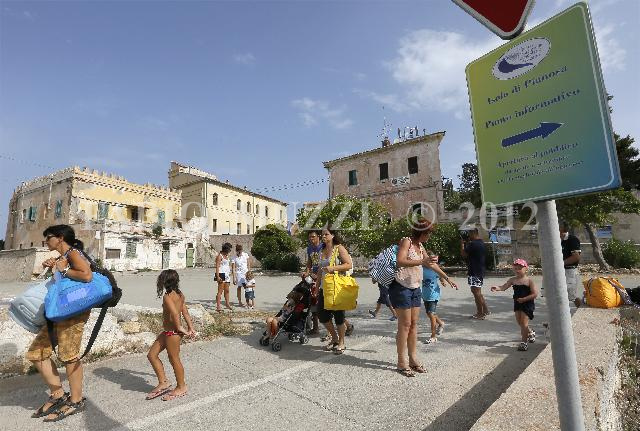 | ITALY, Pianosa Isle : Tourist arrive in Pianosa Isle, on 07 August, 2012. Pianosa is one of the seven isles part of the arcipelago of tuscany. Since 1858 is a penal colony, in 1970 high security prison, ultimately closed in 1998. Now Pianosa is an uninhabited country, with less than 8 people includes 5 inmates. They work into a social cooperation San Giacomo that manage the single point of tourist's reception. (AFP PHOTO / FABIO MUZZI) | IMAGE_4795.JPG | 06/08/12 16.51 | |