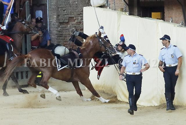 | ITALY, Siena : Italian Carabinieri fall off during the parade in General Proof prior the Palio horse race of tomorrow, in Siena on August 15, 2012. The Palio medieval race is held twice a year in Siena with jockeys riding bareback around a makeshift race course set up in the city's central square. AFP PHOTO/ FABIO MUZZI | IMAGE_4797.JPG | 15/08/12 19.16 | |