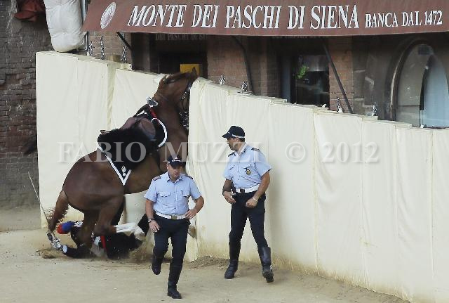 | ITALY, Siena : Italian Carabinieri fall off during the parade in General Proof prior the Palio horse race of tomorrow, in Siena on August 15, 2012. The Palio medieval race is held twice a year in Siena with jockeys riding bareback around a makeshift race course set up in the city's central square. AFP PHOTO/ FABIO MUZZI | IMAGE_4798.JPG | 15/08/12 19.16 | |