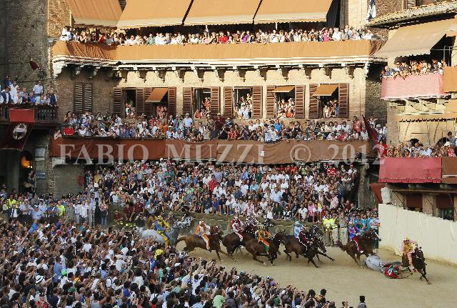 | ITALY, Siena : Riders compete in the Palio horse race in Siena on August 16, 2012. The Palio medieval race is held twice a year in Siena with jockeys riding bareback around a makeshift race course set up in the city's central square. AFP PHOTO/ FABIO MUZZI | IMAGE_4801.JPG | 16/08/12 19.10 | |