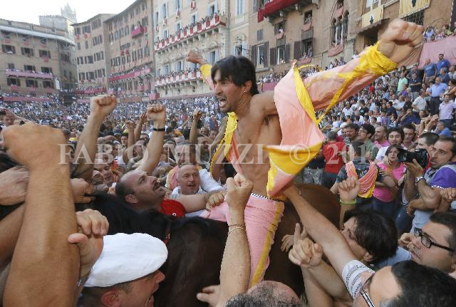 | ITALY, Siena : Jockey Jonatan Bartoletti of the Contrada of Ram is celebrated by his supporters after won the race in the Palio horse race in Siena on August 16, 2012. The Palio medieval race is held twice a year in Siena with jockeys riding bareback around a makeshift race course set up in the city's central square. AFP PHOTO/ FABIO MUZZI | IMAGE_4807.JPG | 16/08/12 19.12 | |