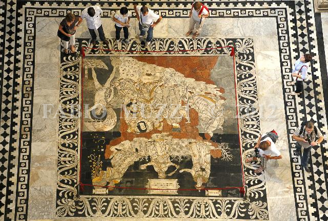 | ITALY, Siena : tourists visit mosaic on the pavement of the Saint Maria Assunta Dome in Siena, on August 30, 2012 (AFP PHOTO / FABIO MUZZI) | IMAGE_4817.JPG | 30/08/12 10.36 | |
