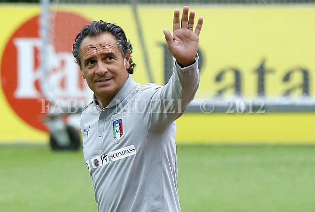 | ITALY, COVERCIANO : Italy's national football coach team Cesare Prandelli cheers with supporters during the training session at the Italian Football Federation technical center in Coverciano, near Florence, on September 3, 2012. Italy will play Bulgaria in a World Cup 2014 qualification match on September 7 in Sofia. AFP PHOTO / FABIO MUZZI | IMAGE_4828.JPG | 03/09/12 17.46 | |