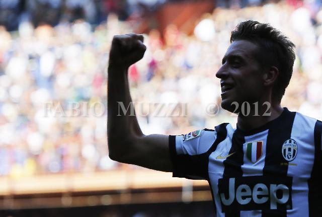 | ITALY, Genova : Juventus' Emanuele Giaccherini celebrates (R) together Mirko Vulcinic after striked against Genoa during their serie A football match at Luigi Ferraris stadium in Genova on September 16, 2012. AFP PHOTO / FABIO MUZZI | IMAGE_4831.JPG | 16/09/12 16.15 | |