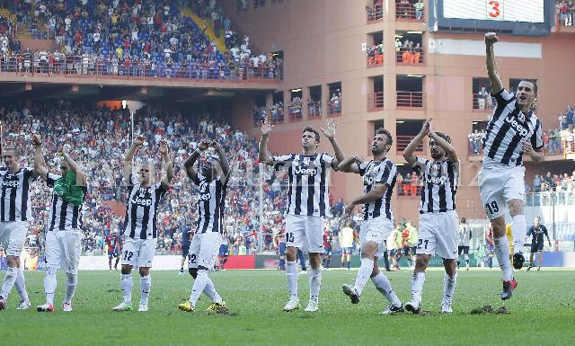| ITALY, Genova : Juventus' palyers celebrate the victory at he end of the match won against Genoa for 3-1 in their serie A football match at Luigi Ferraris stadium in Genova on September 16, 2012. AFP PHOTO / FABIO MUZZI | IMAGE_4836.JPG | 16/09/12 16.50 | |