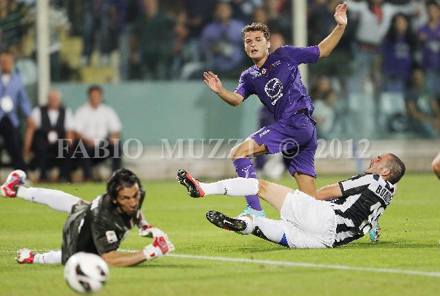 | ITALY, Florence : Fiorentina's Adem Ljajic of Serbia ( C ) tries to scores against Juventus' goalkeeper Gianluigi Buffon during their seria A soccer match at Artemio Franchi stadium in Florence, on September 25, 2012. (AFP PHOTO / FABIO MUZZI) | IMAGE_4850.JPG | 25/09/12 21.27 | |