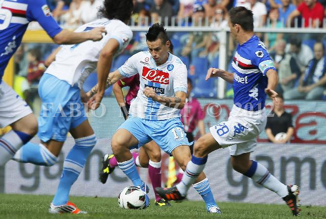 | ITALY, Genova : Napoli's Marek Hamsik of Slovacchia (C) ain action during their serie A football match at Luigi Ferraris stadium in Genova on September 30, 2012. AFP PHOTO / FABIO MUZZI | IMAGE_4876.JPG | 30/09/12 15.02 | |