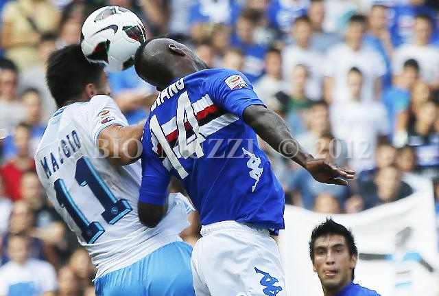| ITALY, Genova : Napoli's Christian Maggion(L) and Sampdoria's Pedro Oblang of Spain fight for tha ball during their serie A football match at Luigi Ferraris stadium in Genova on September 30, 2012. AFP PHOTO / FABIO MUZZI | IMAGE_4878.JPG | 30/09/12 15.16 | |