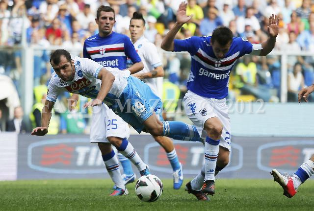 | ITALY, Genova : Napoli's Goran Pandev of Macedonia (L) in action against Sampdoria's Daniele Gastaldello during their serie A football match at Luigi Ferraris stadium in Genova on September 30, 2012 AFP PHOTO / FABIO MUZZI | IMAGE_4884.JPG | 30/09/12 16.17 | |