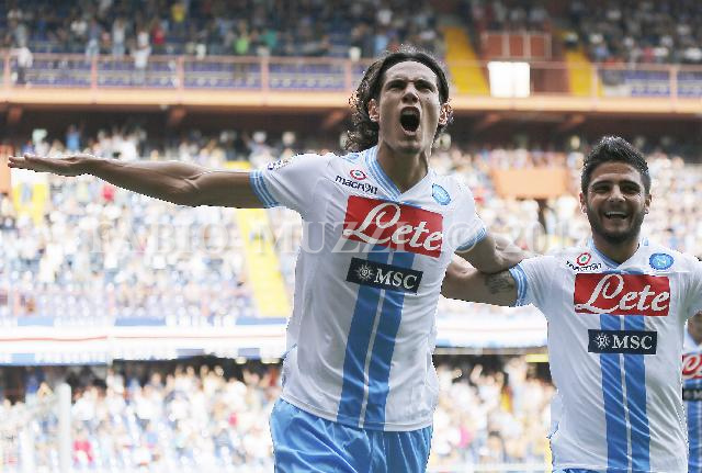 | ITALY, Genova : Napoli's Edison Cavani of Urugualy (L) celebrates together Lorenzo Insigne after kick his penalty and score 1-0 aga inst Sampdoria during their serie A football match at Luigi Ferraris stadium in Genova on September 30, 2012. AFP PHOTO / FABIO MUZZI | IMAGE_4886.JPG | 30/09/12 16.21 | |
