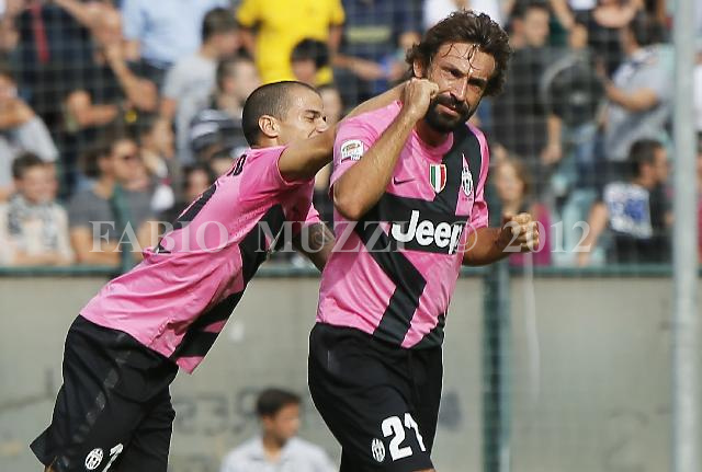 | ITALY, Siena : Juventus' Andrea Pirlo (R) rcelebrates toigether Sebastian Giovinco after scoring 1-0 against Siena during their serie A football match at Atemio Franchi stadium in Siena on October 7, 2012. AFP PHOTO / FABIO MUZZI | IMAGE_4903.JPG | 07/10/12 15.12 | |