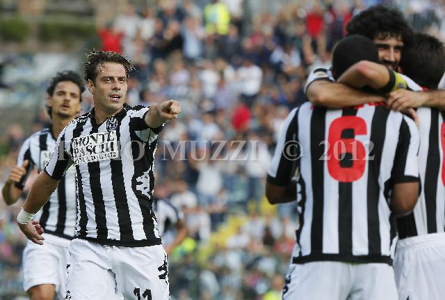 | ITALY, Siena : Siena's Emanuele Calaio' (2L) celebrates after scoring 1-1 against Juventus during their serie A football match at Artemio Franchi stadium in Siena on October 7, 2012. AFP PHOTO / FABIO MUZZI | IMAGE_4907.JPG | 07/10/12 15.45 | |
