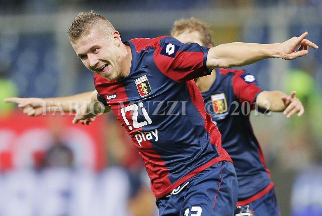 | ITALY, Genova : Genoa's Juraj Fucka of Slovacchia (R) celebrates after scored against AS Roma 1-0 during their serie A football match at Luigi Ferraris stadium in Genova on October 21, 2012. AFP PHOTO / FABIO MUZZI | IMAGE_4917.JPG | 21/10/12 20.50 | |