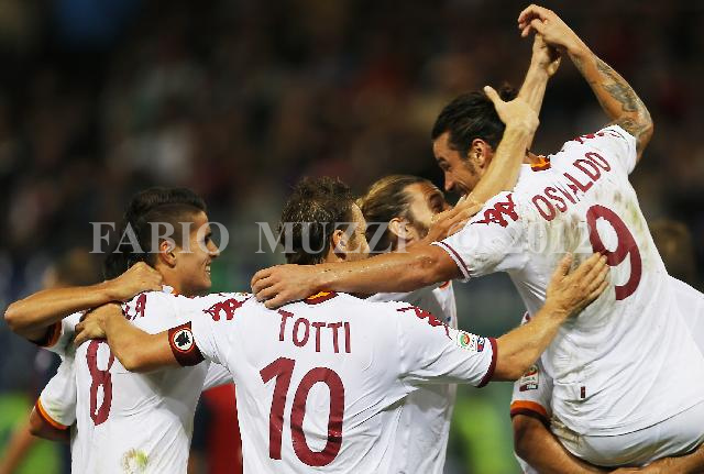 | ITALY, Genova : AS Roma's players celebrtate after the score 4-2 of Erik Lamela of Argentina during their serie A football match at Luigi Ferraris stadium in Genova on October 21, 2012. AFP PHOTO / FABIO MUZZI | IMAGE_4932.JPG | 21/10/12 22.23 | |