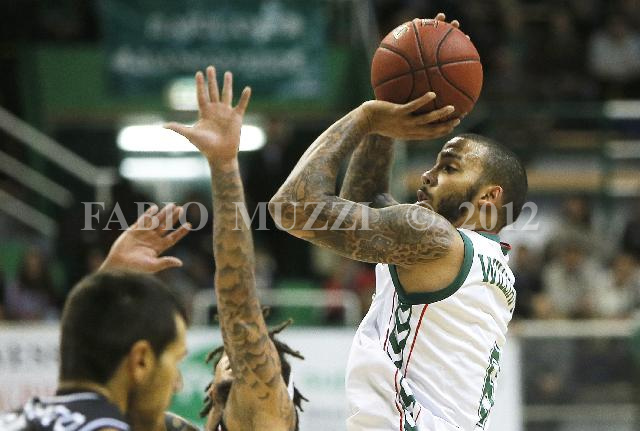 | ITALY, Siena : Unicaja's Malaga Marcus Williams (R) runs the ball past Montepaschi's Siena Marco Carraretto during their Euroleague basketball Regular Season, Game 8 match in Siena on November 30, 2012. AFP PHOTO / FABIO MUZZI | IMAGE_4947.JPG | 30/11/12 21.22 | |