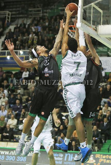 | ITALY, Siena : Montepaschis' Siena Daniel Hackett (L) and teammate Tomas Ress (R) tries to block the action of Unicaja's Malaga Augusto Cesar Lima during their Euroleague basketball Regular Season, Game 8 match in Siena on November 30, 2012. AFP PHOTO / FABIO MUZZI | IMAGE_4948.JPG | 30/11/12 21.30 | |