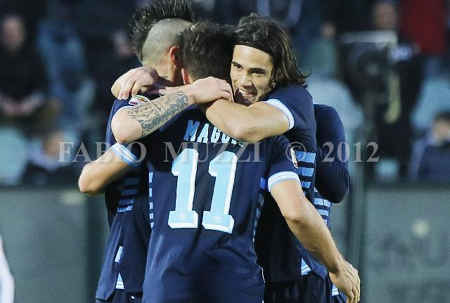 | ITALY, Siena : Napoli's Christian Maggio (C) is celebrated by teammates after scored 1-0 against Siena during their serie A football match at Artemio Franchi stadium in Siena on December 22, 2012. AFP PHOTO / FABIO MUZZI | IMAGE_4955.JPG | 22/12/12 17.41 | |