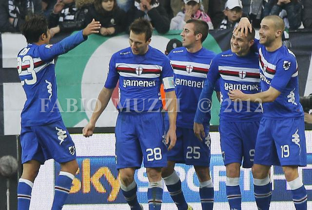 | ITALY, Turin : Sampdoria's Mauro Icardi of Argentina (2R) celebrates after scored 1-2 against Juventus during their serie A football match at the "Juventus Stadium" in Turin on January 06, 2013. AFP PHOTO / FABIO MUZZI | IMAGE_4966.JPG | 06/01/13 17.22 | |