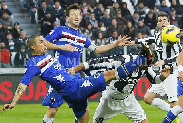 | ITALY, Turin : Sampdoria's Andrea Palombo (L) in action against Juventus' Mirko Vulcinic of Montenegro during their serie A football match at the "Juventus Stadium" in Turin on January 06, 2013. AFP PHOTO / FABIO MUZZI | IMAGE_4968.JPG | 06/01/13 17.31 | |
