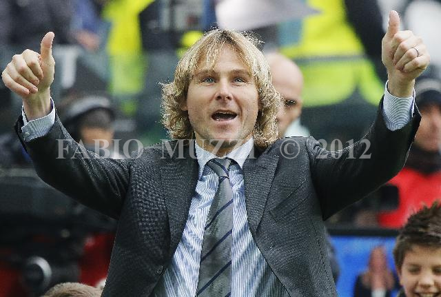 | ITALY, Turin : Juventus' councilman Pavel Nedved cheers with supporters prior the serie A football match at the "Juventus Stadium" in Turin on January 06, 2013. AFP PHOTO / FABIO MUZZI | IMAGE_4973.JPG | 06/01/13 15.38 | |
